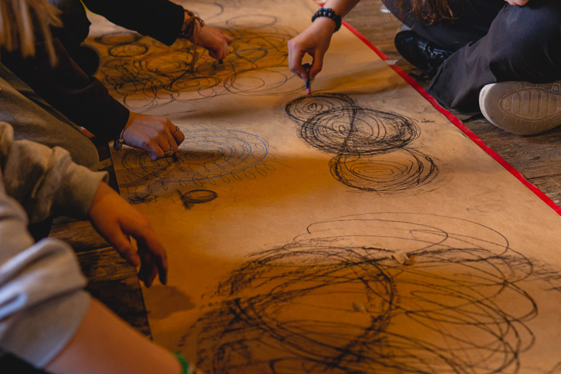 Poznajemy się nawzajem, przestrzeń i format performansu interaktywnego. Tworzymy własne zasady bezpieczeństwa i wsparcia, próbujemy pierwszych zabaw ruchowych i twórczych.